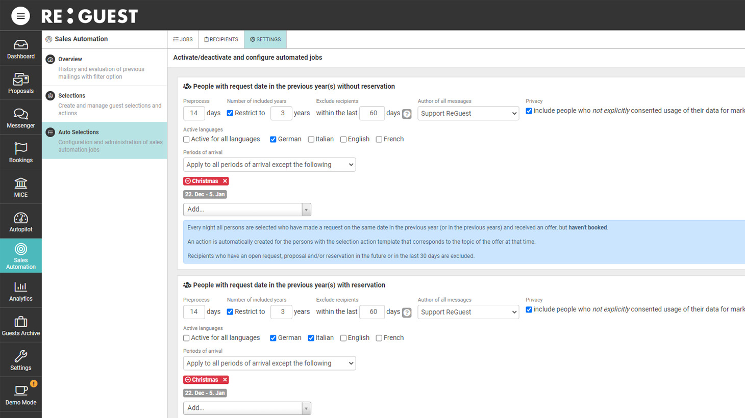 Do you want to activate Sales Automation only for certain travel periods or deactivate it for travel periods that are already well booked? Now possible with the new Sales Automation settings.